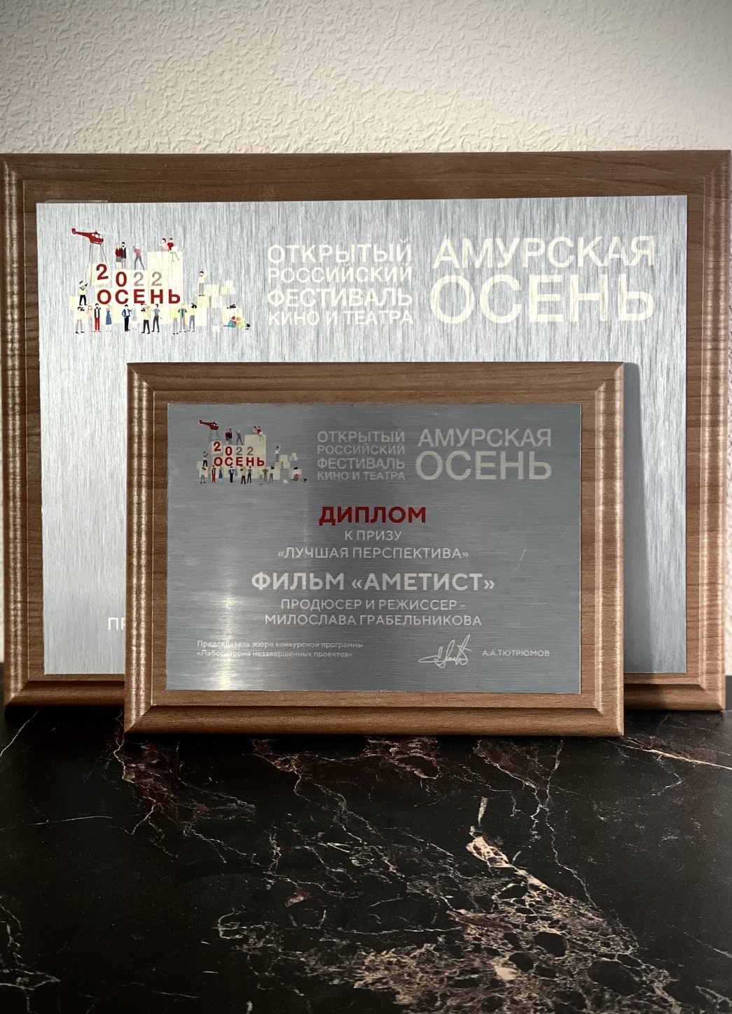 4. Победитель лаборатории незавершенных проектов фестиваля кино и театра "Амурская осень" 2022 г. в номинации "Лучшая перспектива" (К/м фильм "Аметист").