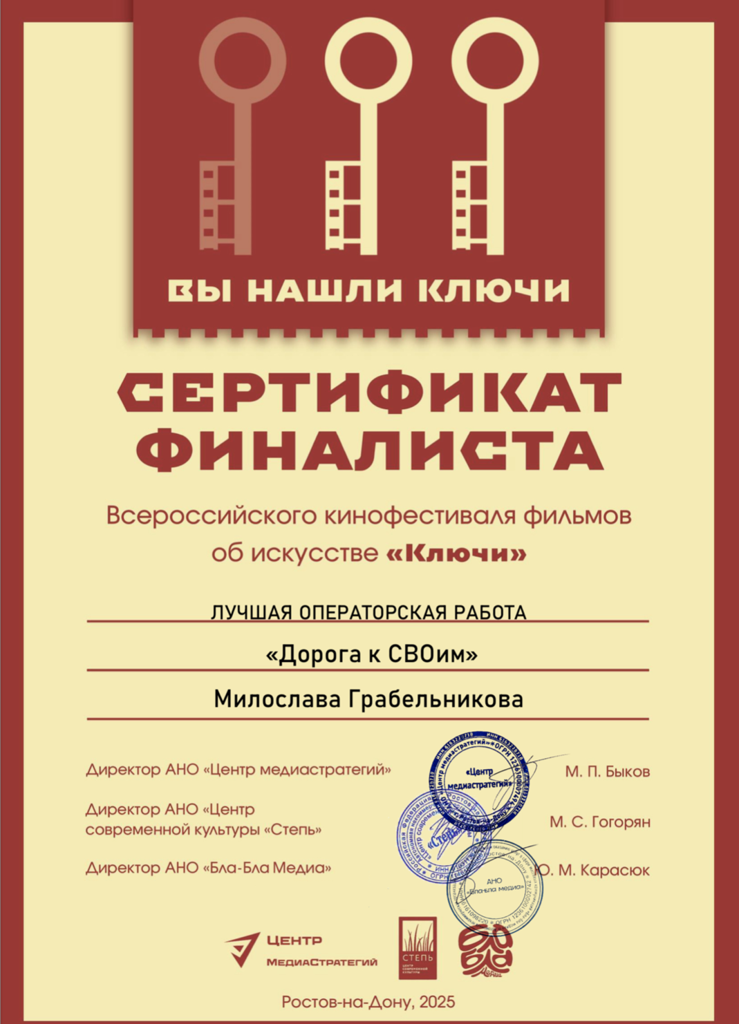 6. Финалист Всероссийского кинофестиваля фильмов об искусстве "Ключи" 2025 в номинации "Лучшая операторская работа" (Документальный фильм "Дорога к СВОим").