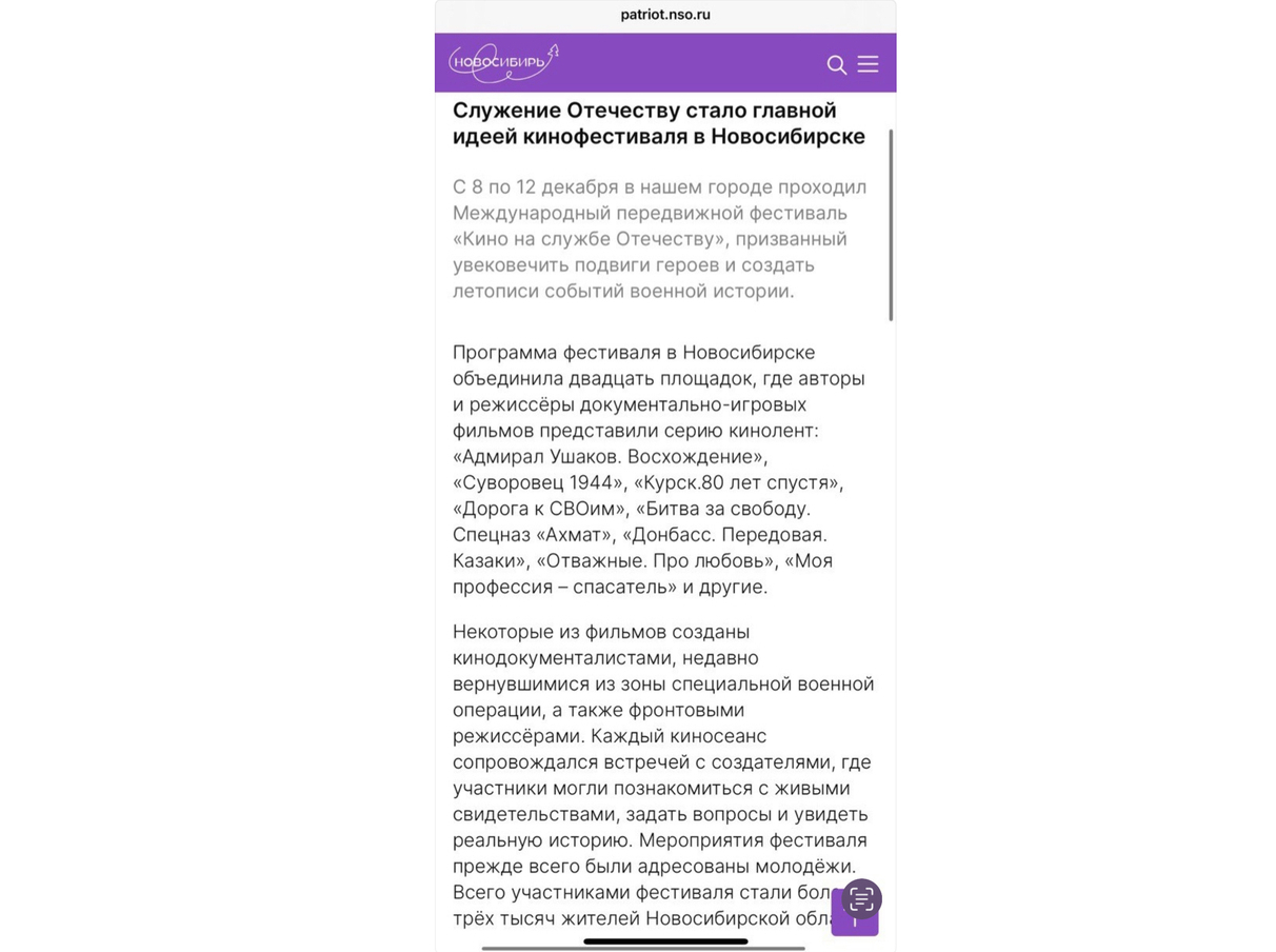 12 декабря 2025 г. в Новосибирске завершился кинофестиваль «Кино на службе отечеству», где был представлен документальный фильм "Дорога к СВОим". Показы прошли на многих площадках города, в том числе в учебных заведениях для детской и юношеской аудитории. Поздравляем героев и участников фильма, а также выражаем благодарность организаторам кинофестиваля.