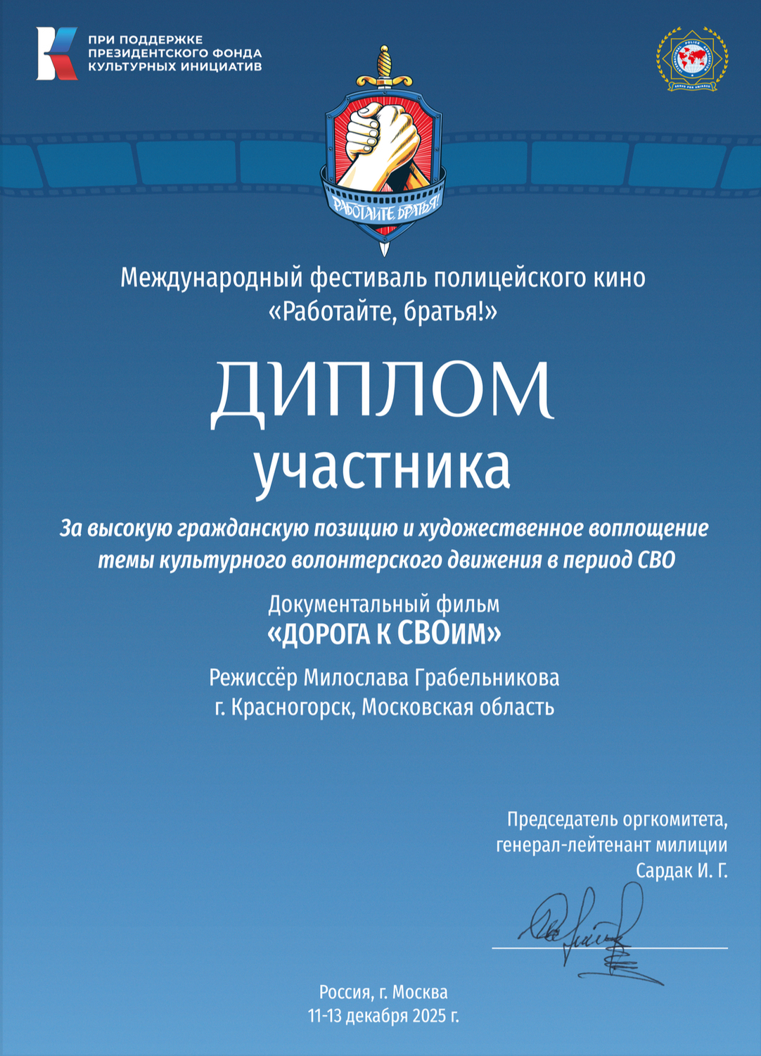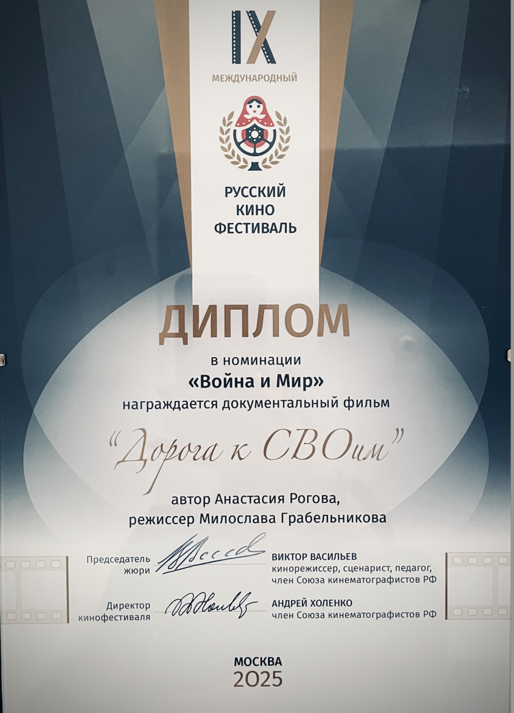 1. Победитель "Международного Русского Кинофестиваля" 2025 в номинации "Война и мир" (Документальный фильм "Дорога к СВОим").